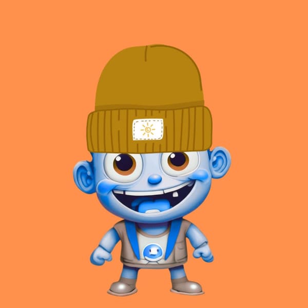 This is a charming, cartoonish boy with an infectious grin that reveals a couple of missing front teeth. He has wide, expressive eyes with bright red pupils, rosy cheeks, and a small, button nose.